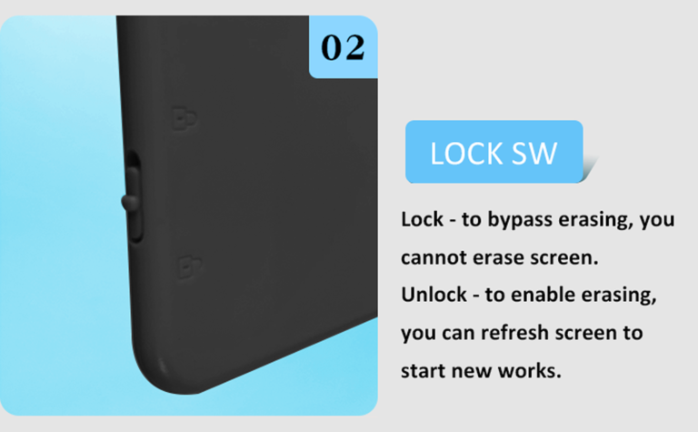 This LCD writing tablet can be used for both adults and children, it works like a small black board, with an erasing key to clear whole screen with 1 touch; and a lock switch to bypass or enable the erasing key.
